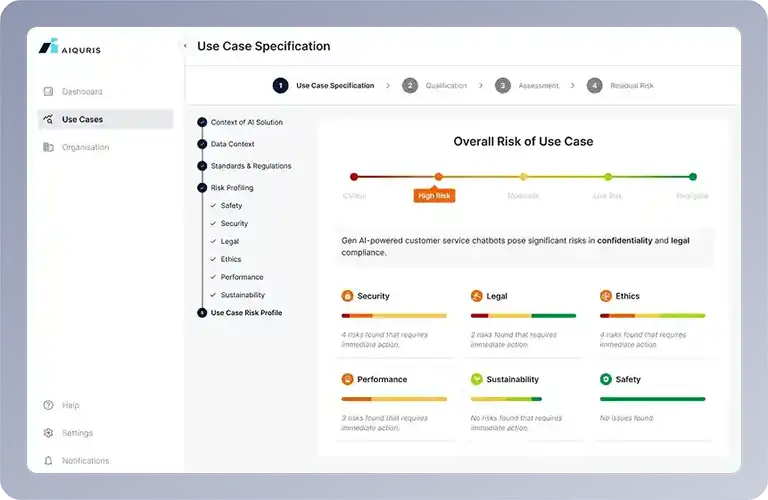 In order to build and scale AI responsibly, all six must be managed simultaneously. Even a single weak spot can derail outcomes and jeopardise safety, security, and trust. AIQURIS helps you identify your AI risks and provides a clear path for managing them. This support continues throughout the entire life of your AI use case, from the decision to implement to ongoing operations. You get a clear, use-case-specific view of real risk and control across the entire AI lifecycle, beyond frameworks and generic checklists.